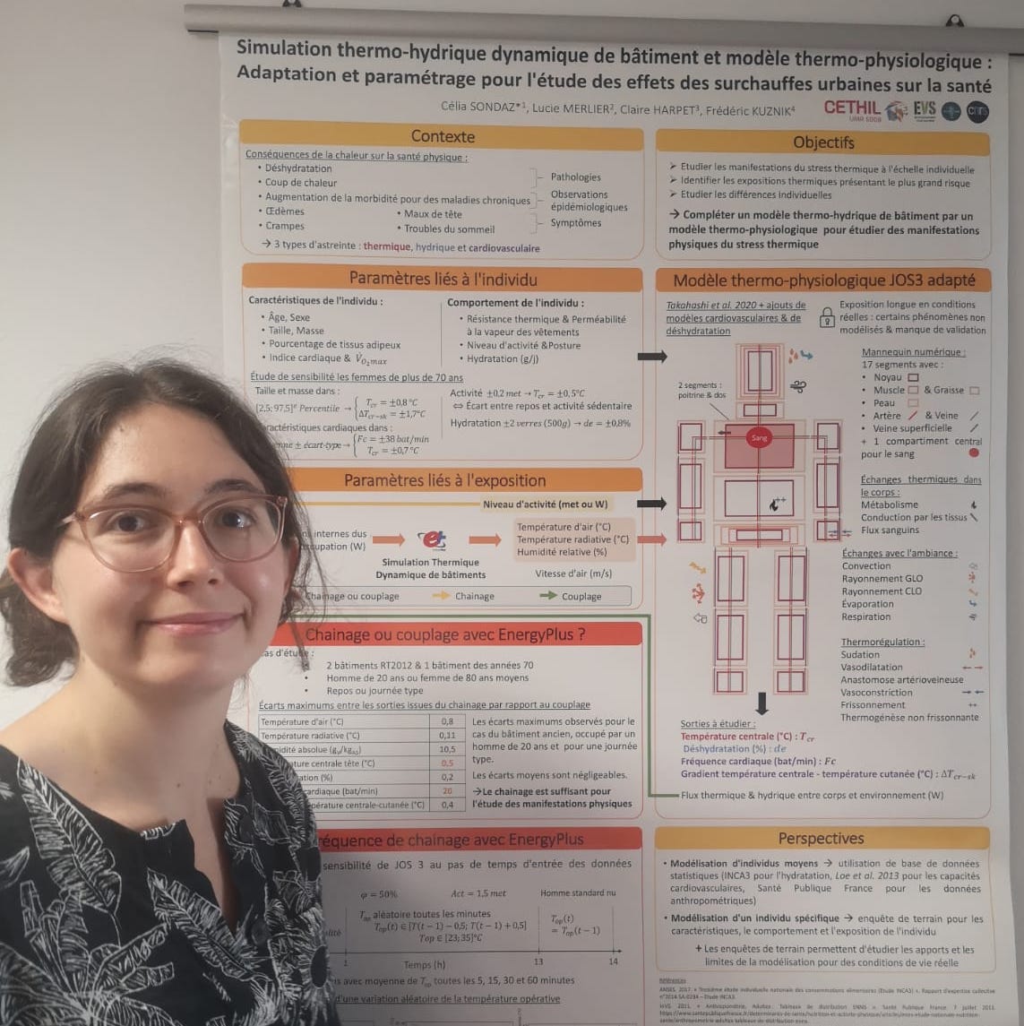 Le travail présenté par Célia Sondaz est intitulé « Simulation thermo-hydrique dynamique de bâtiment et modèle thermo-physiologique : Adaptation et paramétrage pour l'étude des effets des surchauffes urbaines sur la santé ». Il concerne le paramétrage d'un modèle thermo-physiologique à partir données sur les caractéristiques individuelles, sur le comportement et sur l'exposition ainsi que les conditions de son chaînage avec des Simulations Thermiques Dynamiques de bâtiment. L'objectif est de pouvoir simuler le stress thermique et les astreintes physiologiques associées en considérant les variations individuelles et les dynamiques d'exposition à la chaleur.